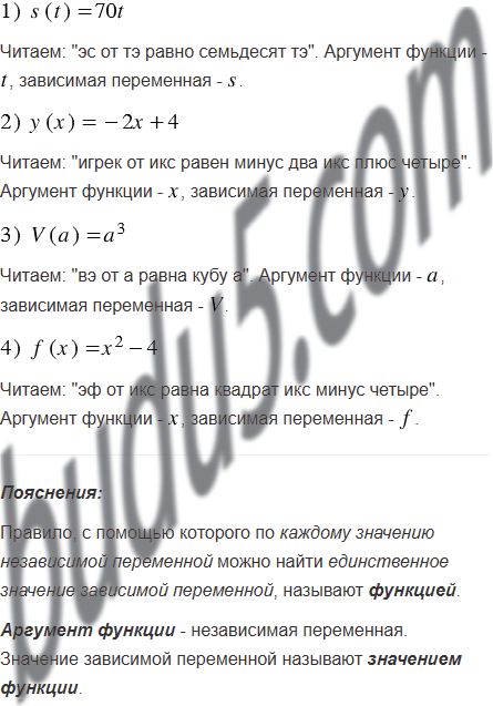 Прочитайте следующую запись, укажите аргумент функции и зависимую переменную: