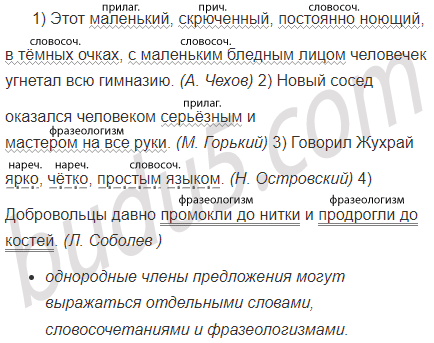 1) Этот маленький, скрюченный, постоянно ноющий, в тёмных очках, с маленьким бледным лицом человечек угнетал всю гимназию. (А. Чехов) 2) Новый сосед оказался человеком серьёзным и мастером на все руки. (М. Горький) 3) Говорил Жухрай ярко, чётко, простым языком. (Н. Островский) 4) Добровольцы давно промокли до нитки и продрогли до костей. (Л. Соболев )
