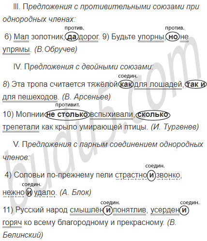 1) Ветер шумел в ответ и приносил хриплое карканье вороньих стай. (К. Паустовский) 2) Надо и знать и любить и беречь свою землю. (В. Песков) 3) Море бывает то ласковое то сердитое то разгневанное. (Р. Гамзатов) 4) Соловьи по-прежнему пели страстно и звонко нежно и удало. (А. Блок) 5) Дуют свежие ветры и высокое небо опрокинулось бледной зеленеющей чашей. (К. Паустовский) 6) Мал золотник да дорог. 7) В природе ни лист ни соломинка не повторяется. (М.Пришвин) 8) Эта тропа считается тяжёлой как для лошадей так и для пешеходов. (В. Арсеньев) 9) Будьте упорны но не упрямы. (В.Обручев) 10) Молнии не столько вспыхивали сколько трепетали как крыло умирающей птицы. (И. Тургенев) 11) Русский народ смышлён и понятлив усерден и горяч ко всему благородному и прекрасному. (В. Белинский) 12) Всё блещет и нежится и радостно тянется к солнцу. (А. Куприн) 13) Целый день шёл дождь и теперь разгулялось. (Л. Толстой)