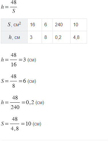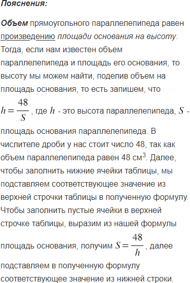Объём прямоугольного параллелепипеда равен 48 см3. Заполните таблицу, в первой строке которой указана площадь его основания, а во второй - высота.