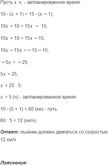 Если лыжник будет двигаться со скоростью 10 км/ч, то доберётся в пункт назначения на 1 ч позже запланированного времени прибытия, а если будет двигаться со скоростью 15 км/ч - то на 1 ч раньше. С какой скоростью он должен двигаться, чтобы прибыть в пункт назначения в запланированное время?