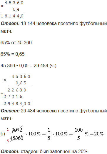 а) Сколько человек посетило футбольный матч, если было занято 5%; 10%; 40%; 65% всех мест?